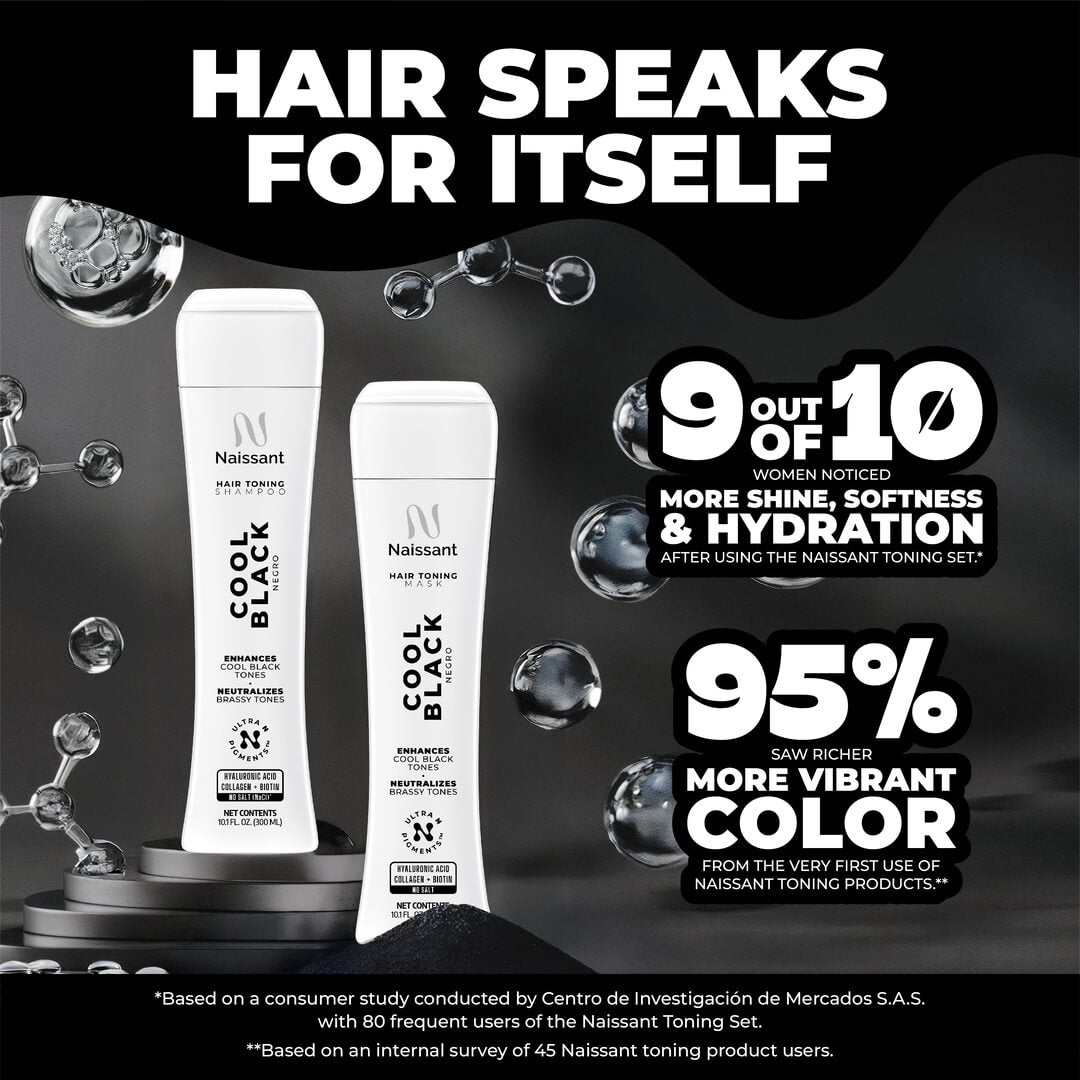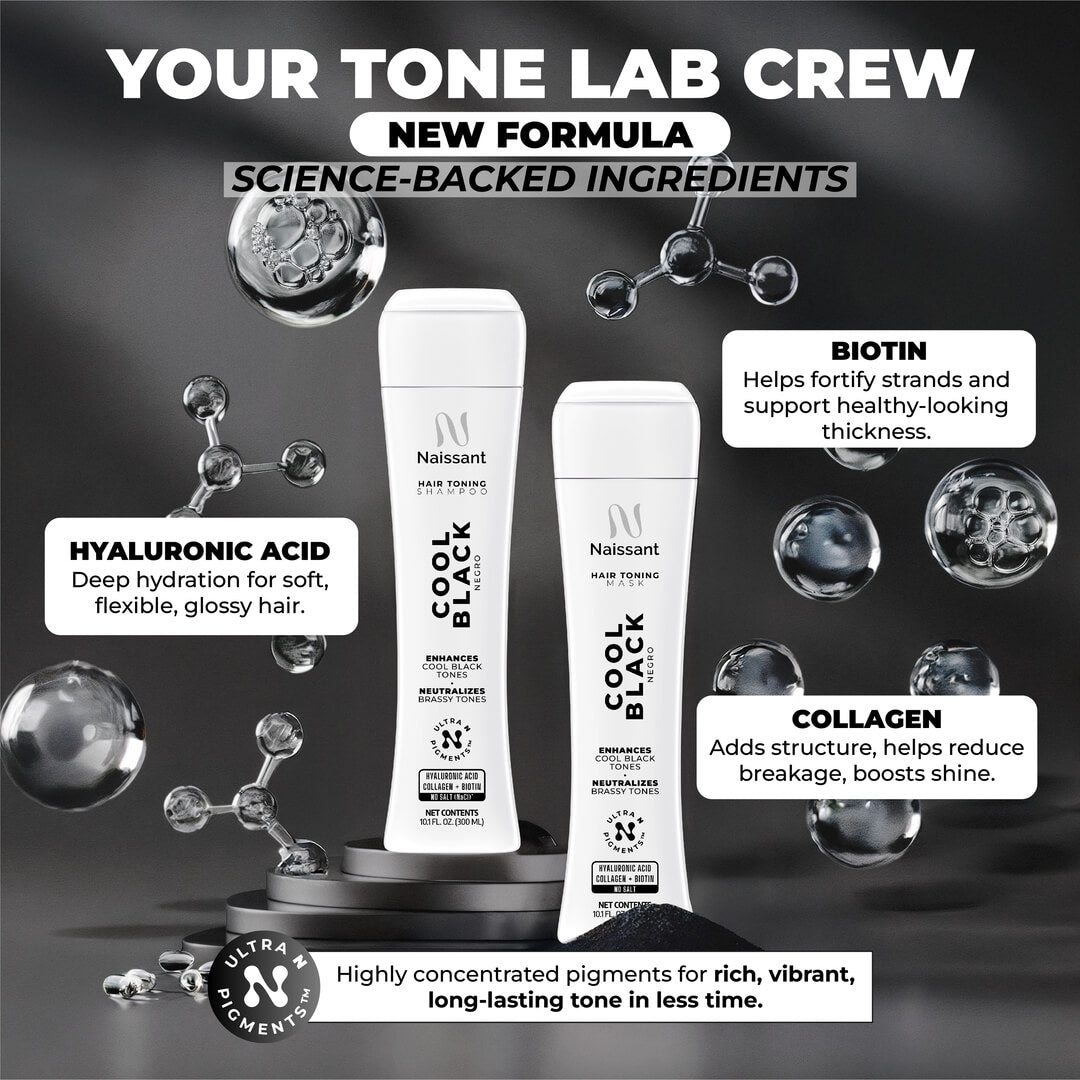 Use weekly or as needed after your Naissant shampoo: apply to damp hair, leave on for 1–5 minutes depending on hair porosity and desired intensity, then rinse thoroughly. The result: a cool, balanced black tone that looks more uniform, refined and salon fresh.