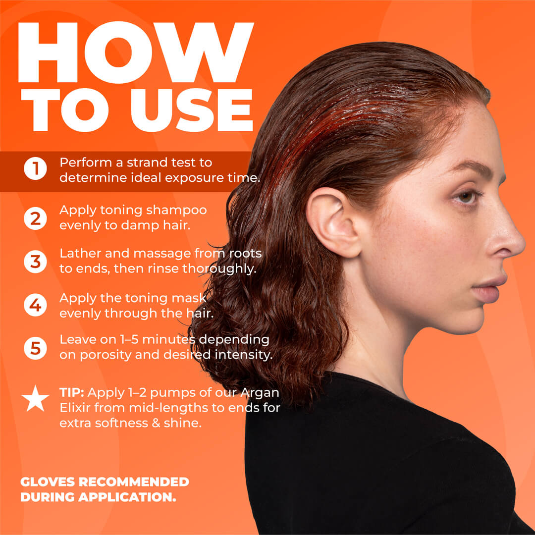 Deposits deep, luminous copper tone: Color-depositing mask that enhances and intensifies copper and red copper hair, ideal for reviving faded copper tones and boosting high-impact, salon-style color.