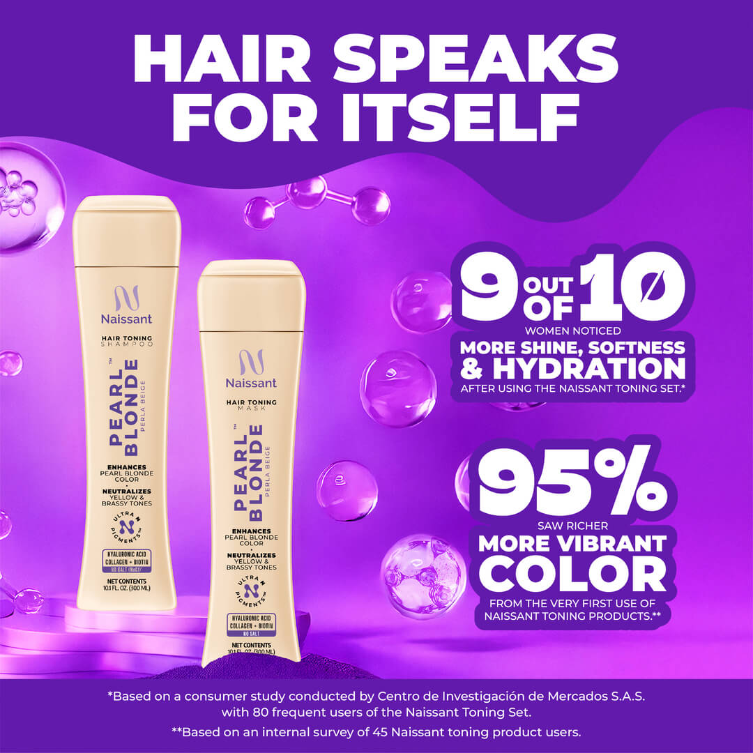 Powered by Naissant Ultra N high-purity violet pigments, this purple shampoo not only prepares the hair fiber but also helps neutralize mild yellow and orange reflections on level 6–8 blondes. The result is a more natural, beige-pearl blonde that looks balanced and less warm—whether used alone or followed by the Naissant Pearl Blonde Hair Toning Mask.