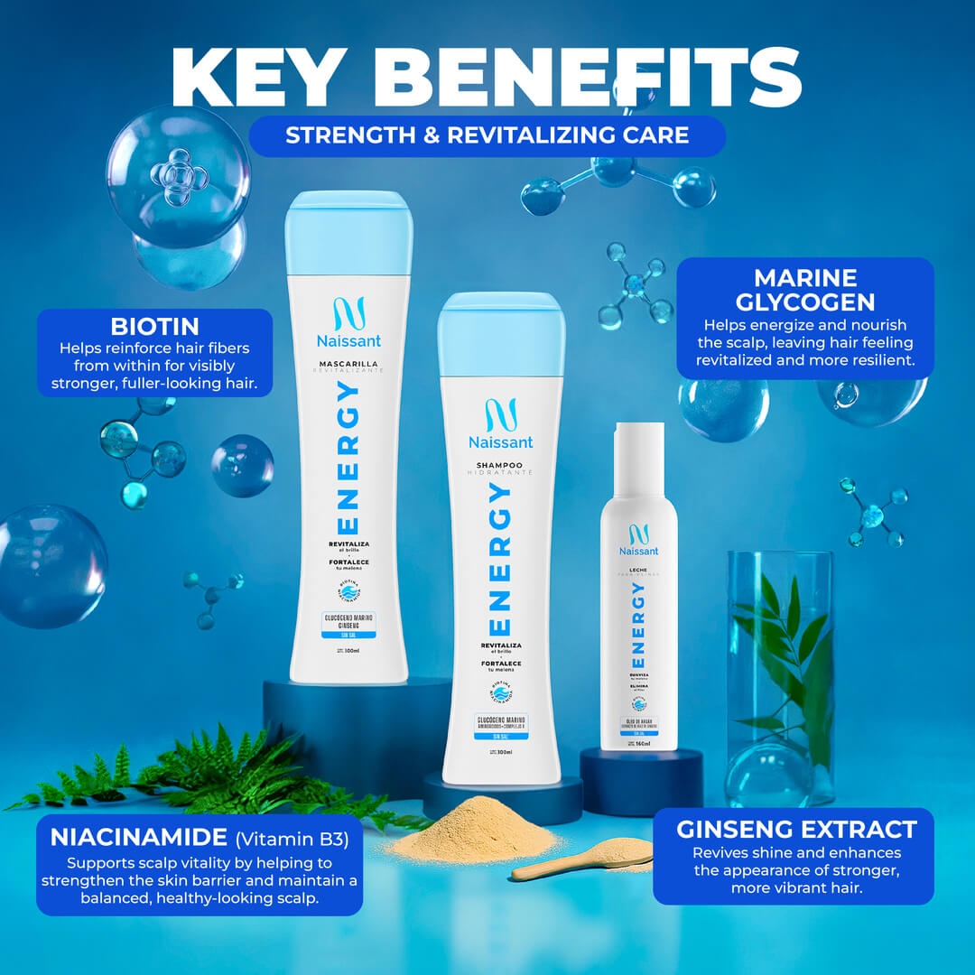 Enhanced Hair Growth and Strengthening: The Energy Line specializes in enhancing hair growth and strengthening hair by using marine glycogen, and natural extracts. These components nourish and reinforce hair follicles, promoting stronger and shinier hair.
